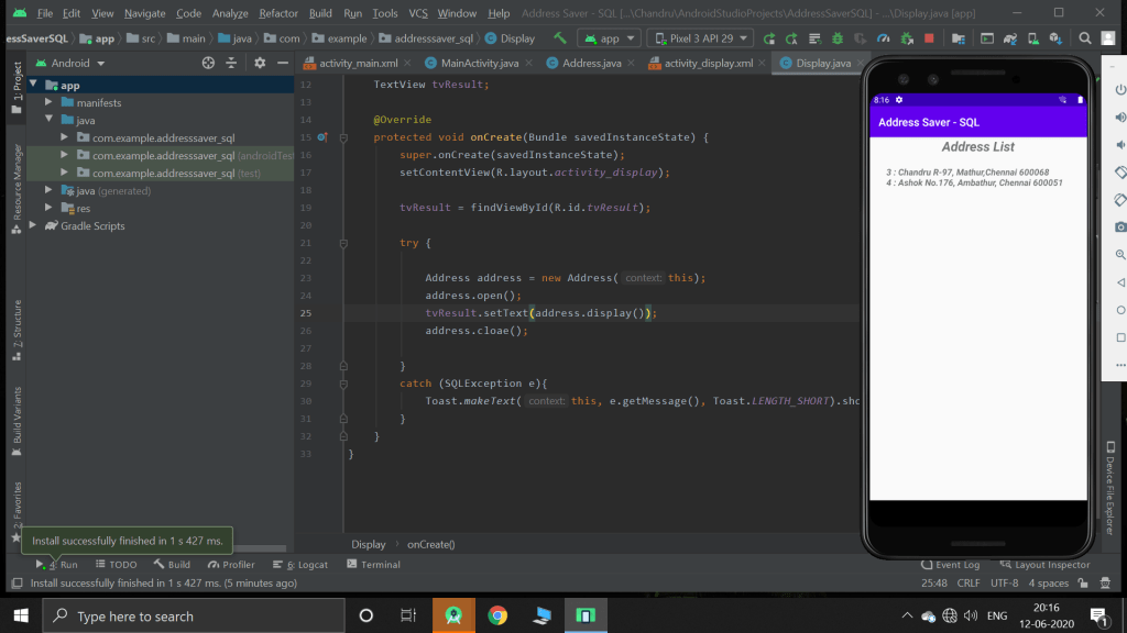 This app collects the address from the user and stores it in the database. When the user choose edit or delete option, I prompts to a new activity