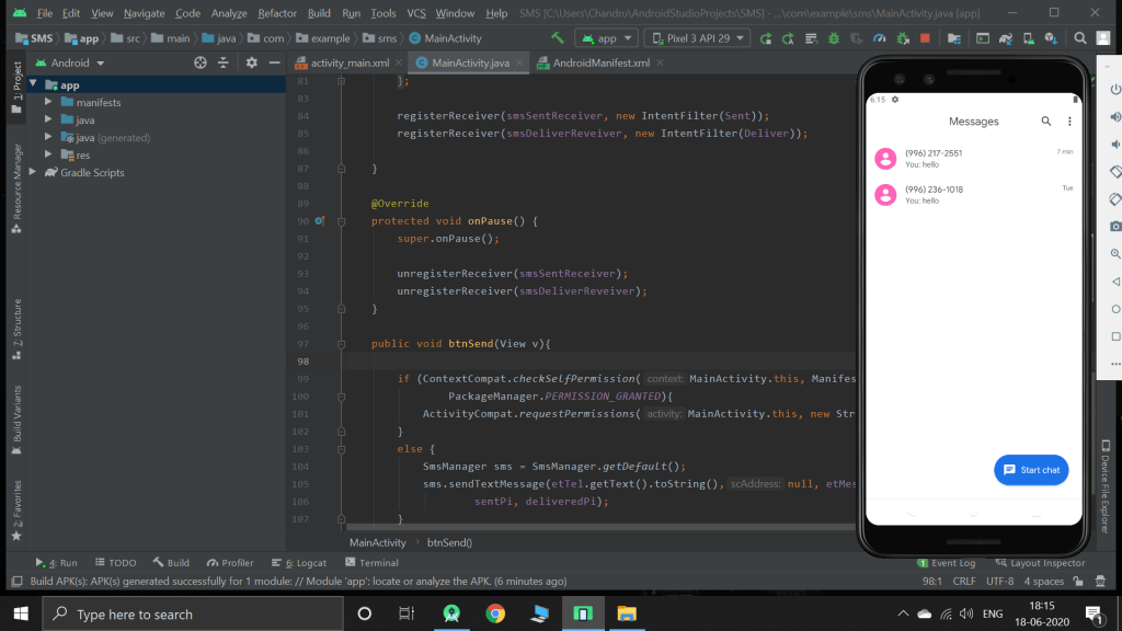 This app will show success message when the message is sent, but in my normal, it didn’t worked. But in emulator it did. Even though it didn’t show pop up, The messages which I tried to send are visible in my phone as shown below.