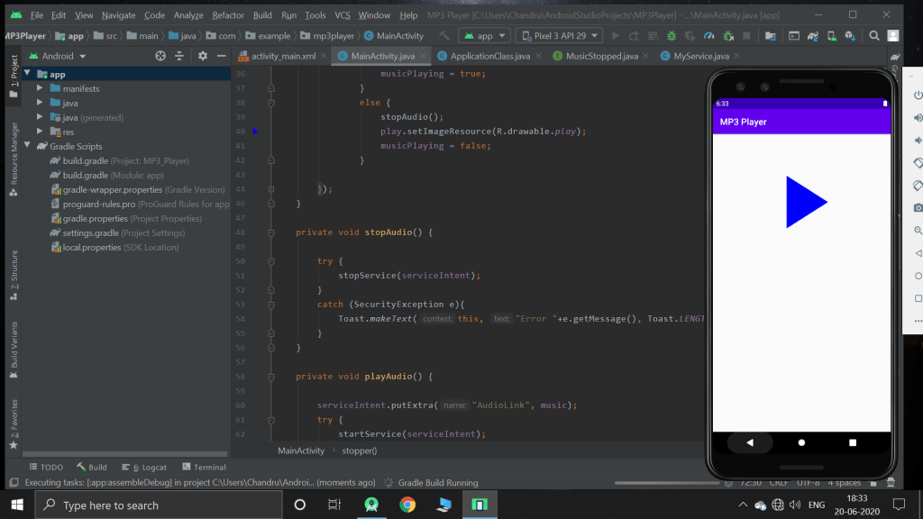 Today, I created a simple mp3 app that plays a online music. The music has to play even when the app is played in the background. For this service method is used. This app plays game of thrones music.