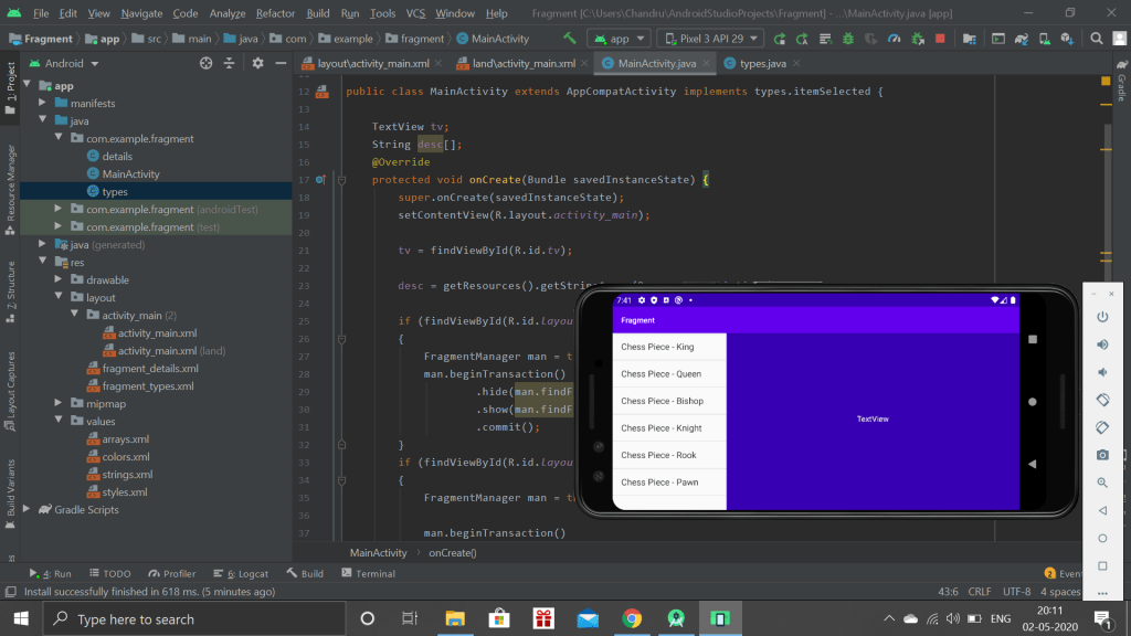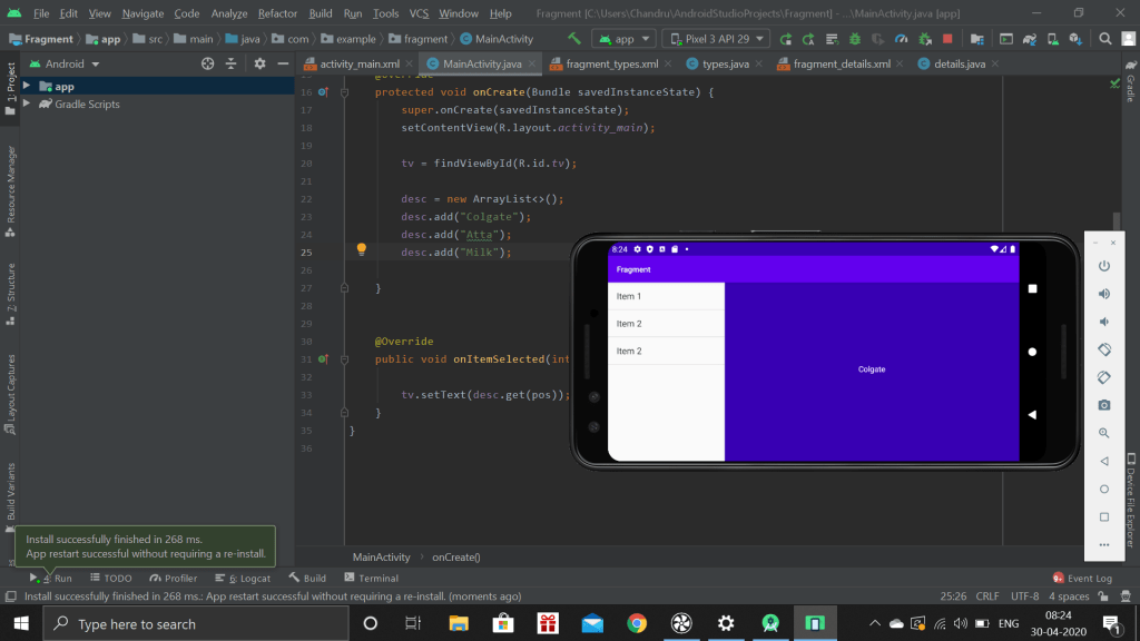 Today, I started working with the fragments. Fragments are used mostly in the landscape mode.